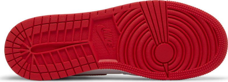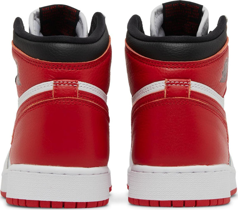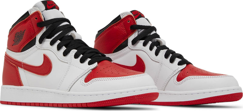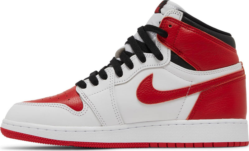 The Air Jordan 1 Retro High OG Heritage GS reimagines the classic Chicago palette with a fresh twist. Its upper is built from smooth white leather with bold University Red overlays and matching red Swooshes, while black accents on the collar and laces offer contrast. A woven Nike Air tongue label and the iconic Wings logo on the ankle maintain the Jordan 1 DNA. Underfoot, an Air-cushioned sole unit delivers comfort with a clean finish.