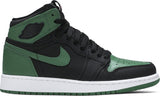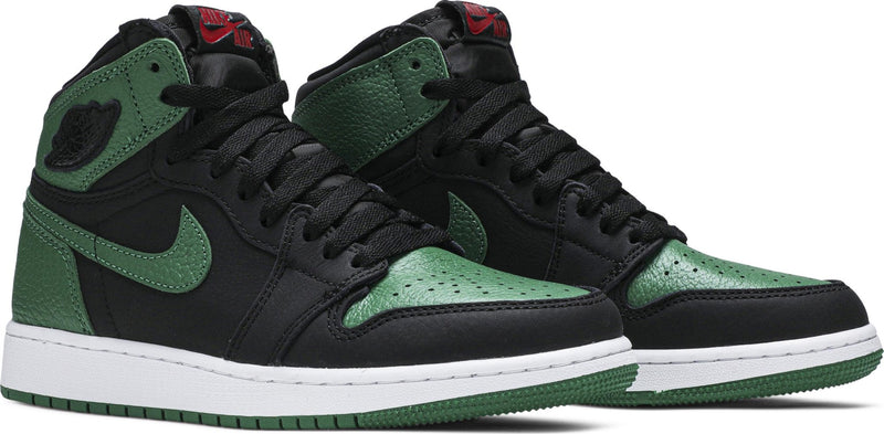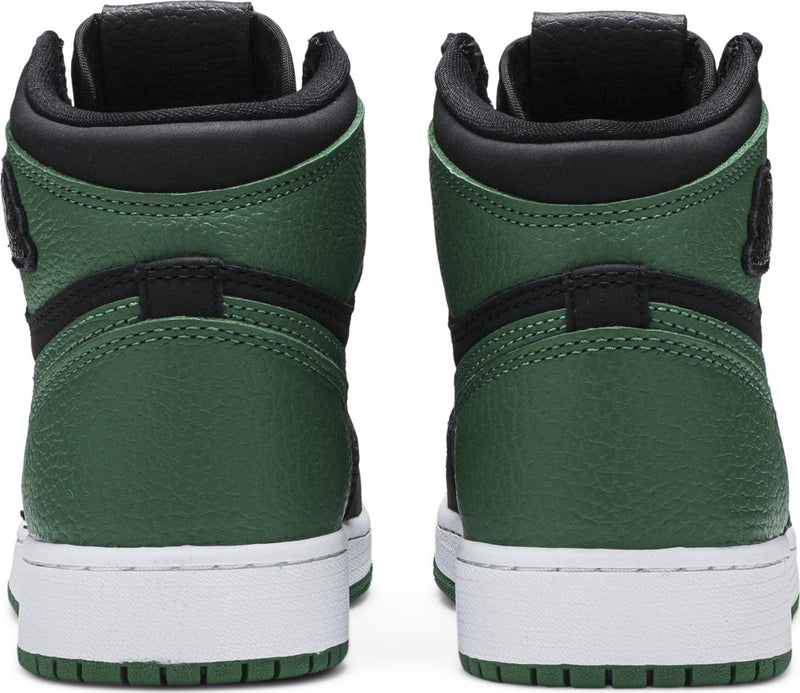 Jordan Brand added new colors to a classic silhouette with the Jordan 1 Retro High Pine Green Black (GS). This colorway draws inspiration from the Jordan 1 Retro High Pine Green from 2019, only this time the entire upper features black and pine green hues.This Jordan 1 High (GS) is comprised of a black tumbled leather upper with green leather overlays. A Gym Red embroidered tongue tag, sail midsole, and pine green outsole completes this design. These sneakers released in February of 2020.