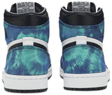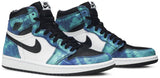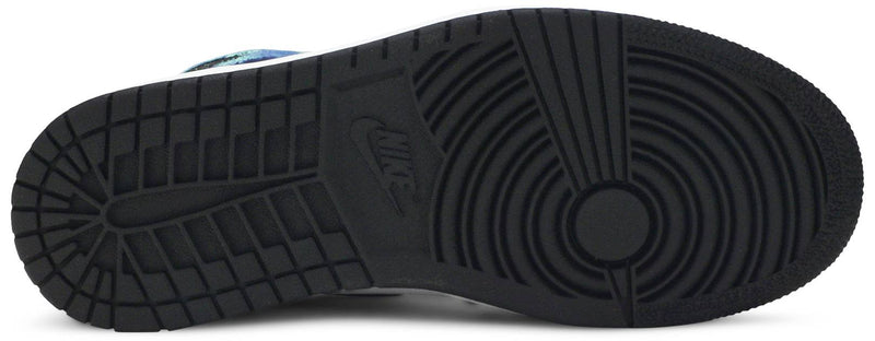 The women’s Air Jordan 1 Retro High OG ‘Tie-Dye’ gives the iconic silhouette a fashion-forward look, highlighted by a faux hand-dyed effect on the sneaker’s heel and forefoot overlays. The swirling blue and teal hues are offset by a white leather quarter panel and contrasting black leather on the collar and toe box. Branding elements include a black Swoosh, matching black Wings logo and a Nike tag atop the lightly padded nylon tongue.